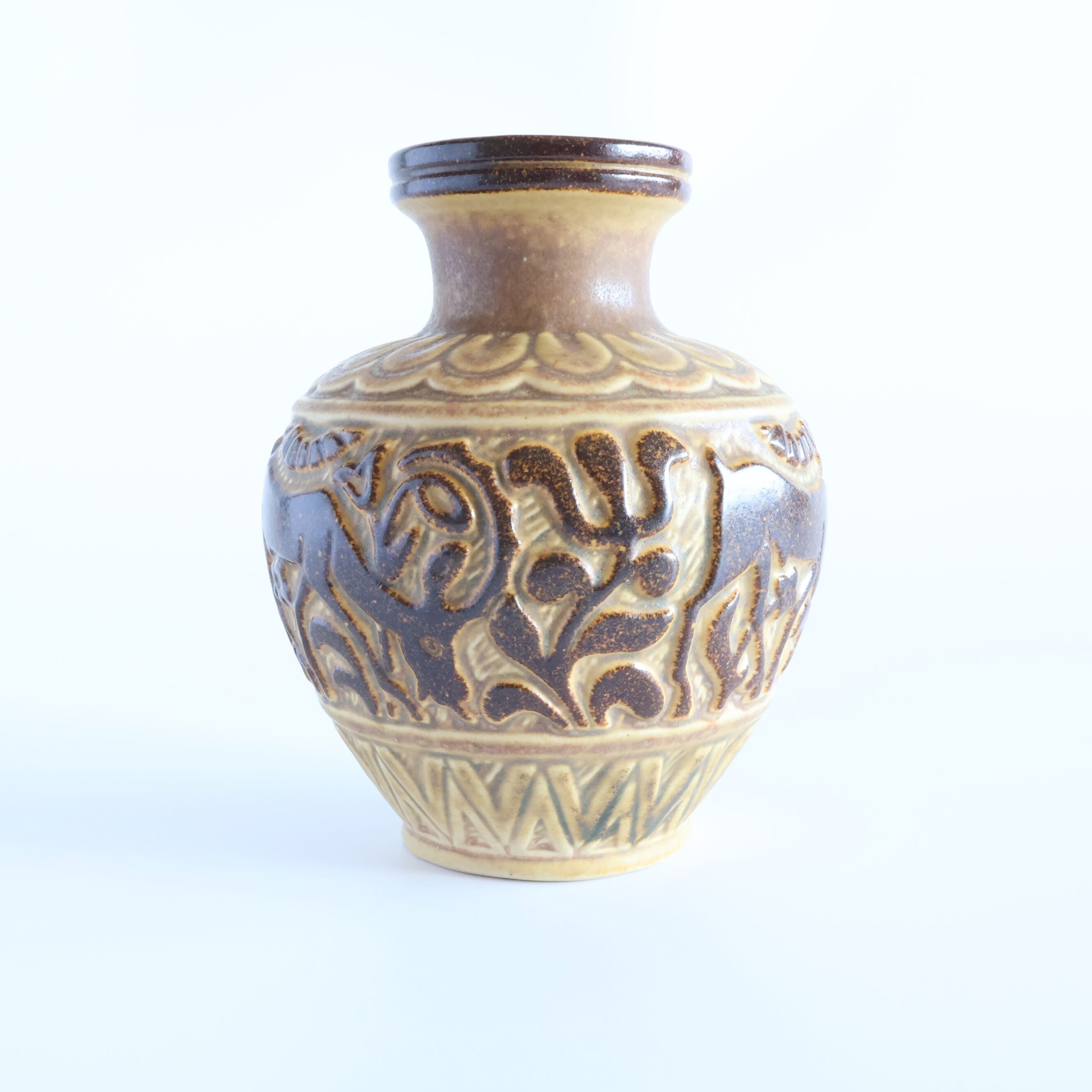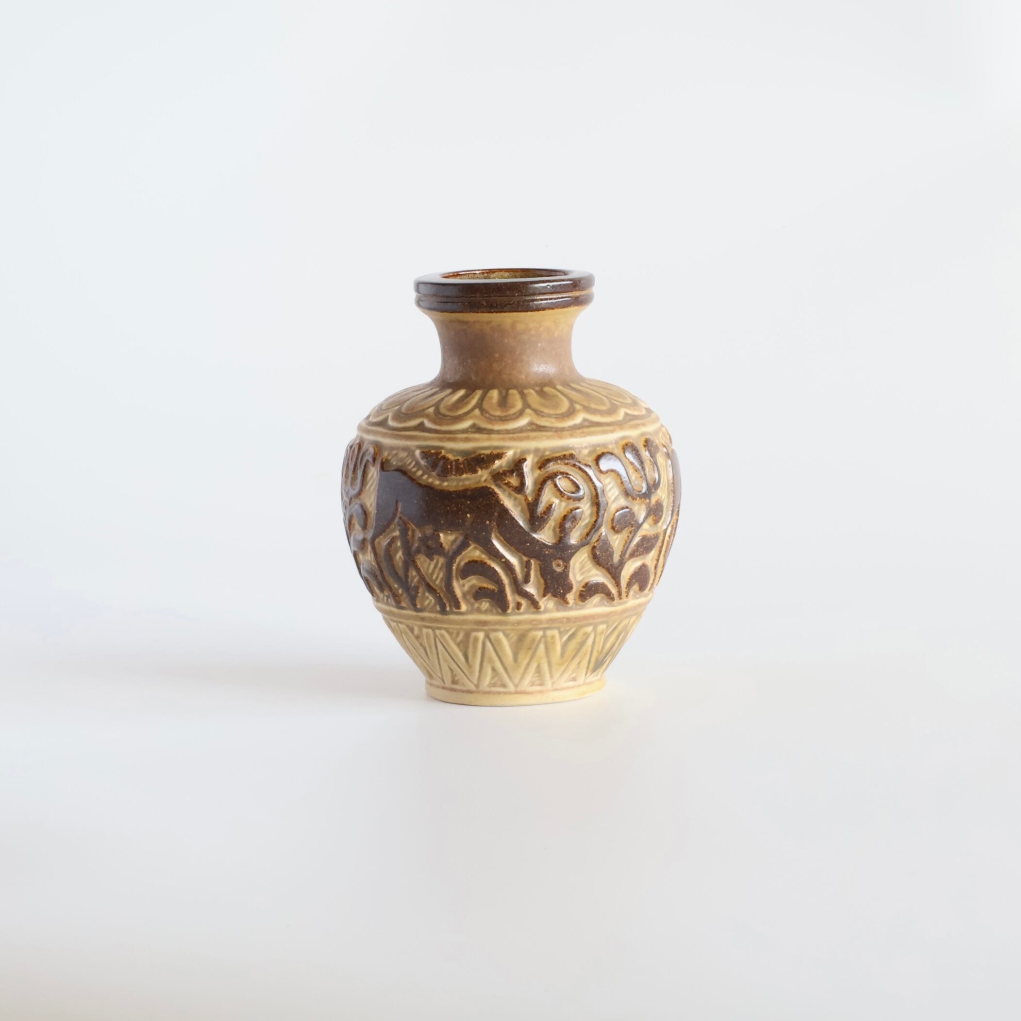 ドイツ出身のMarianne Starck(マリアンヌ・スタルク)デザインで明るいベージュベースに、茶色の釉薬で見事な角の雄鹿と植物が浮き彫りされてます。まるで木彫りのような素朴でとても可愛らしいデザインです。丸みのある安定したデザインで、植物を飾りやすい花瓶です。