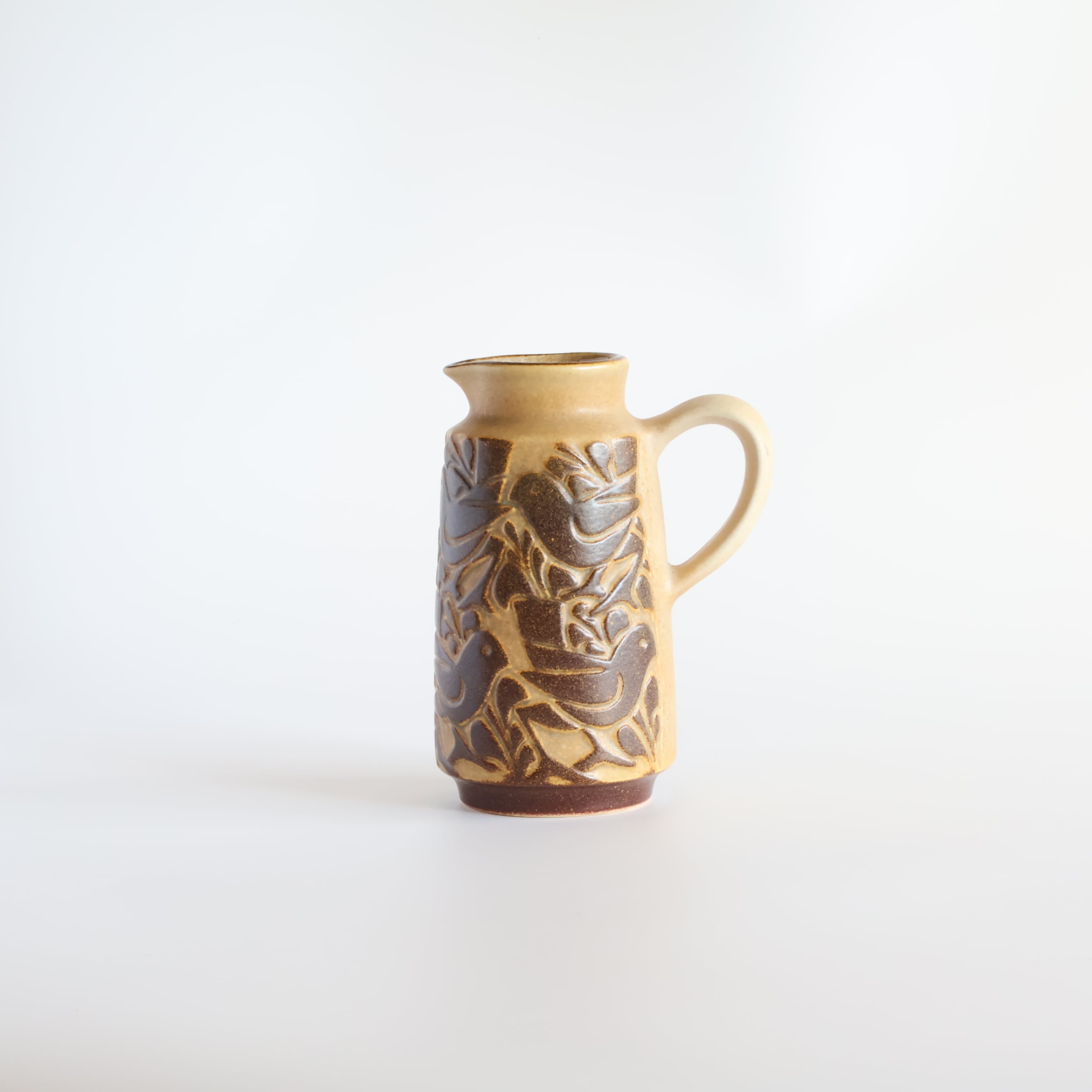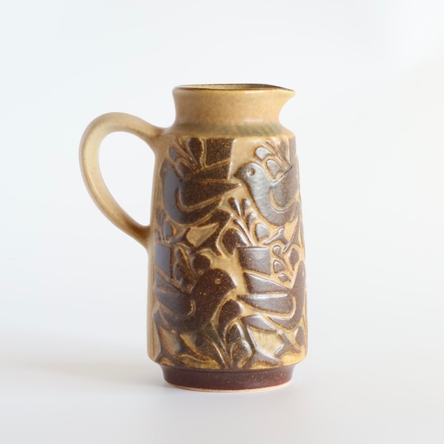 ドイツ出身のMarianne Starck(マリアンヌ・スタルク)デザインで明るいベージュベースに、茶色の釉薬で鳥や植物が浮き彫りされてます。まるで木彫りのような素朴でとても可愛らしいデザインです。人気の取手付きのデザインで、安定感もあり植物を飾りやすいです。