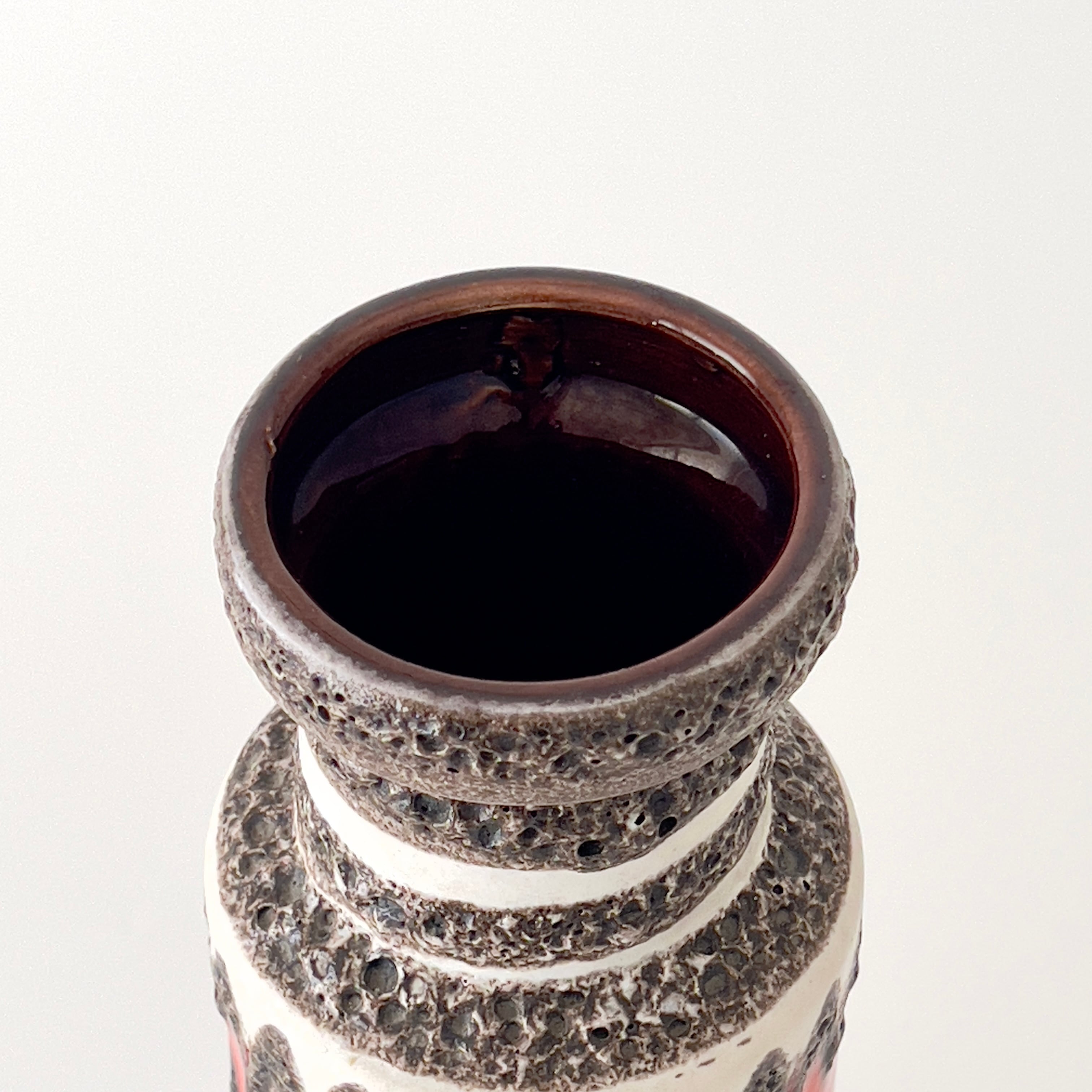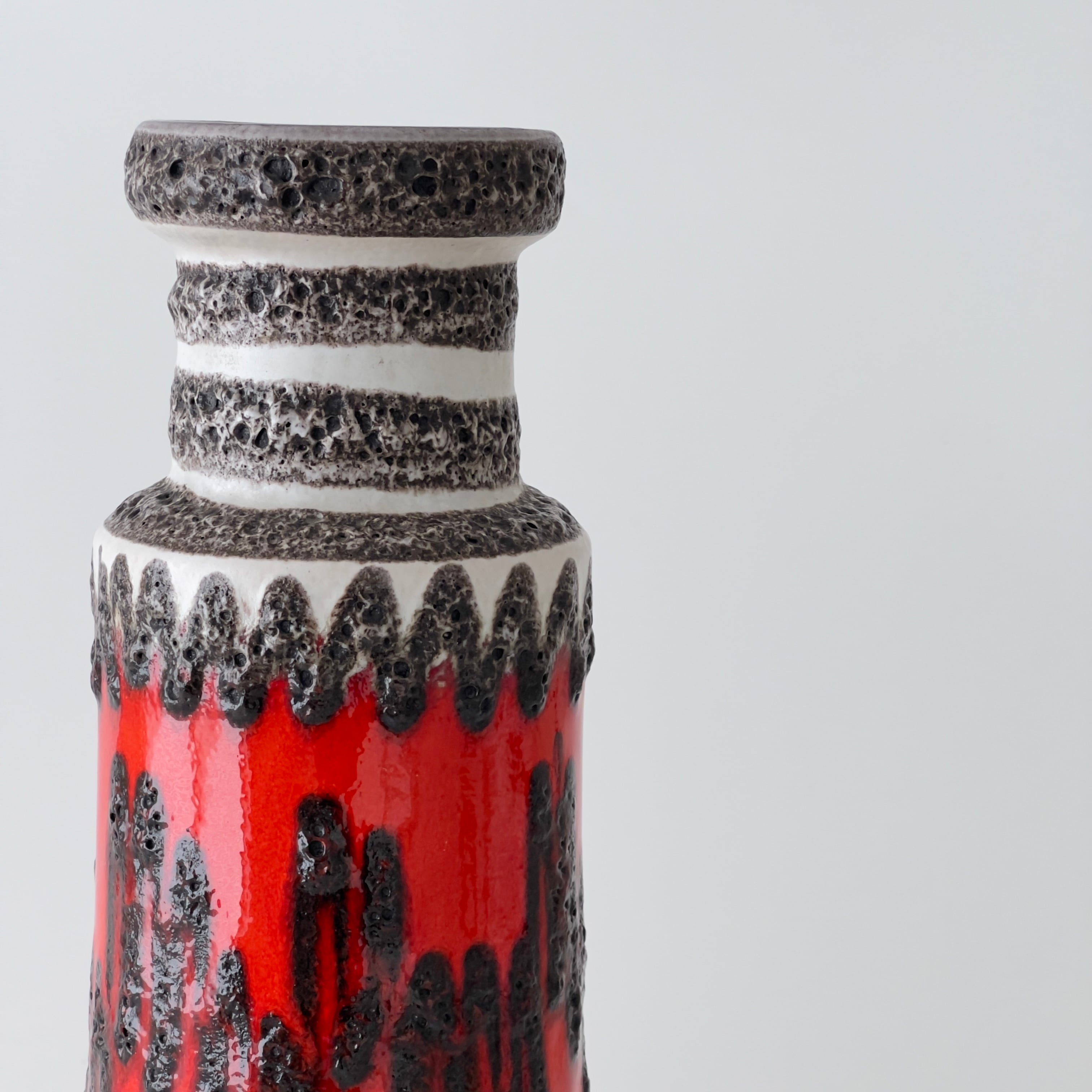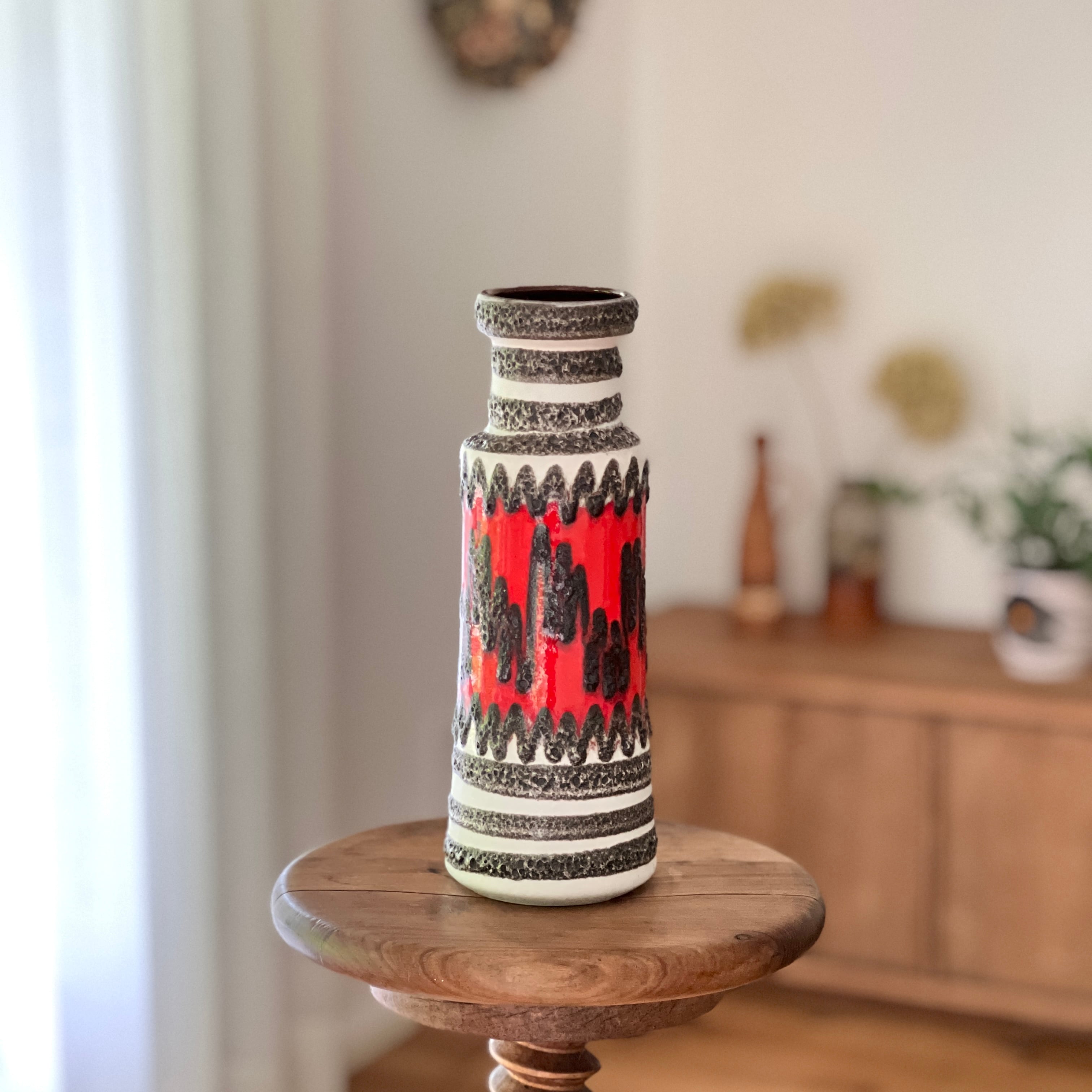 West German Art Potteryを語る上で欠かせない大手メーカーScheurich社のFatLavaの花瓶です。 溶岩釉薬で描かれたジグザグ模様がユニークで、ユーカリなどのグリーンや枝物はもちろん、鮮やかな色合いの花が良く似合います。