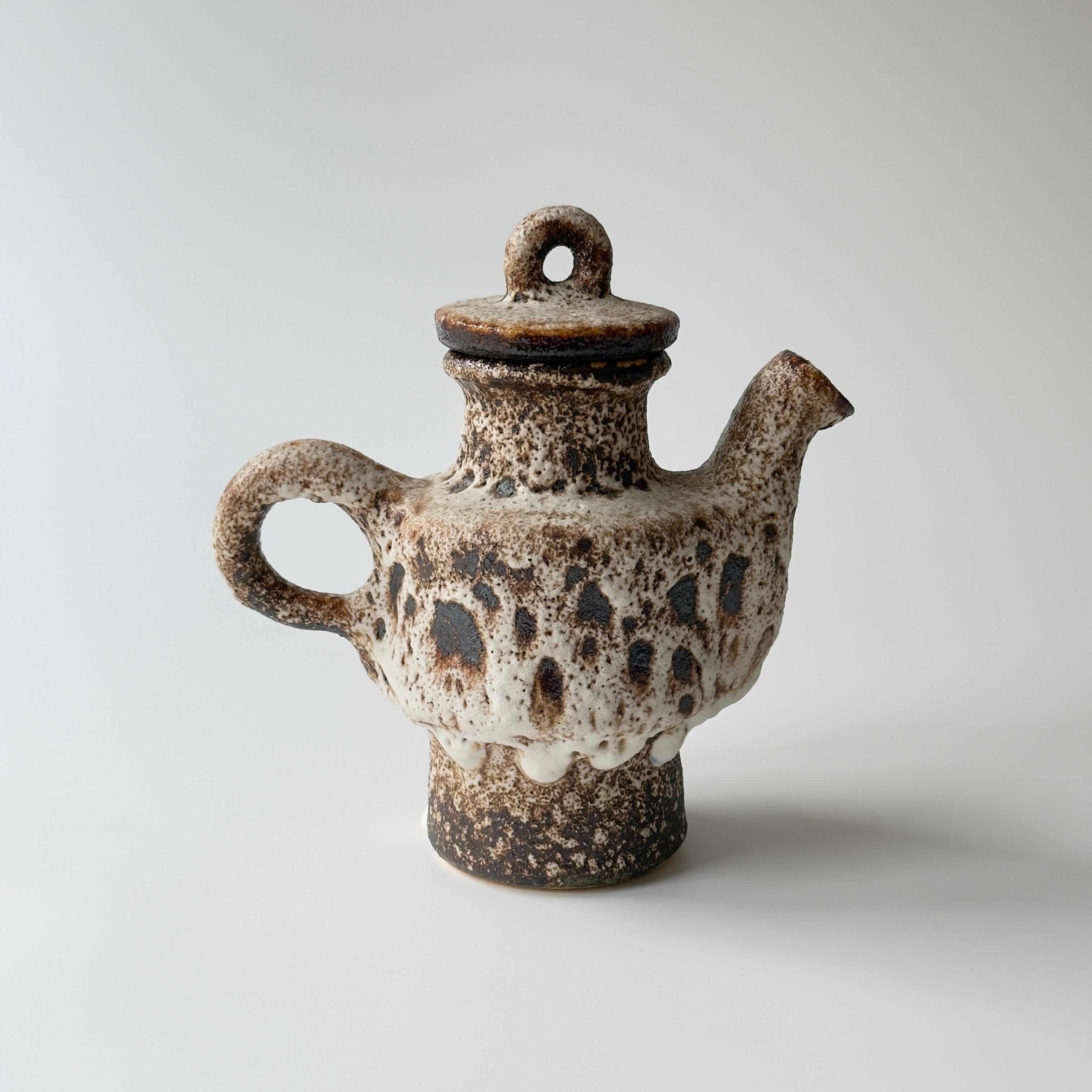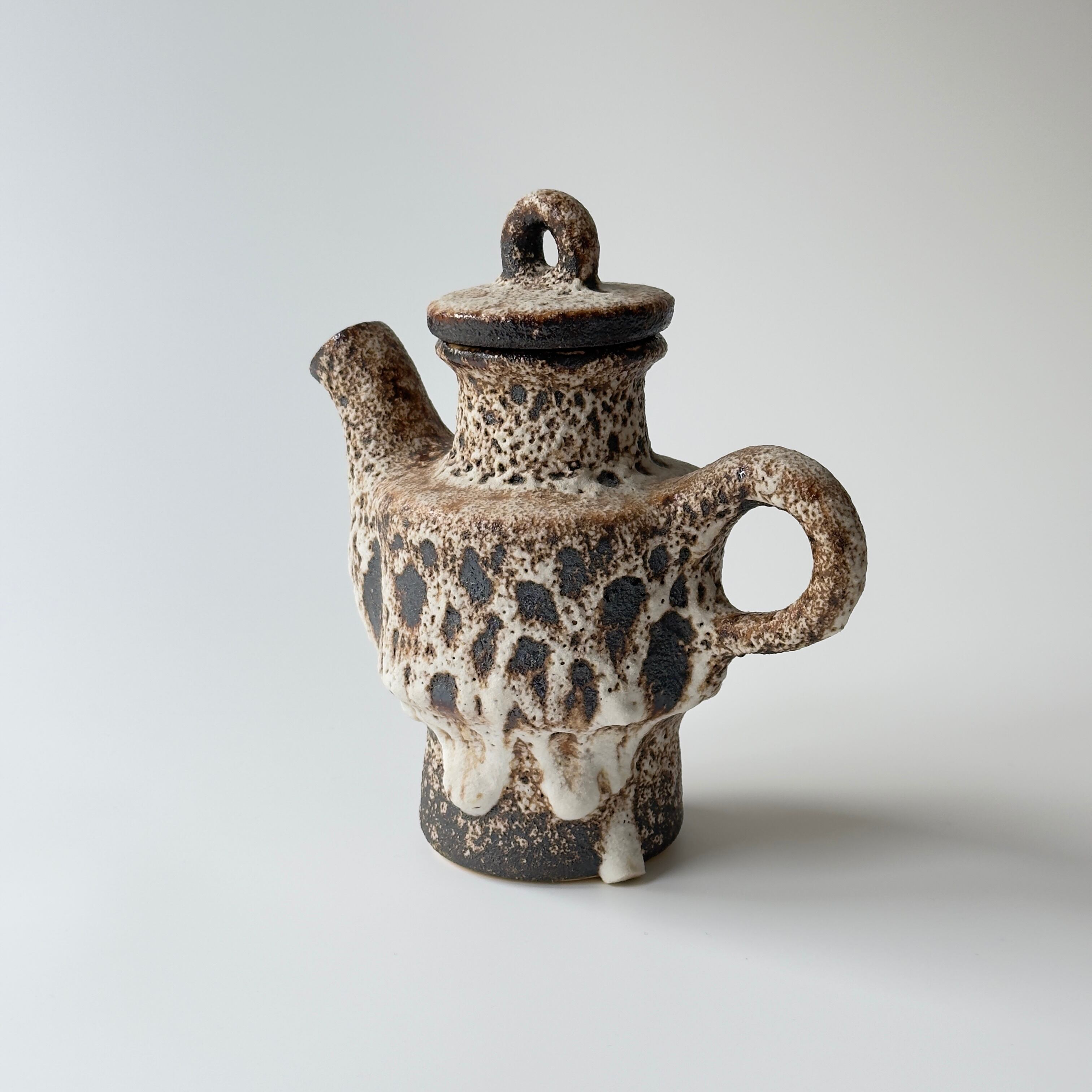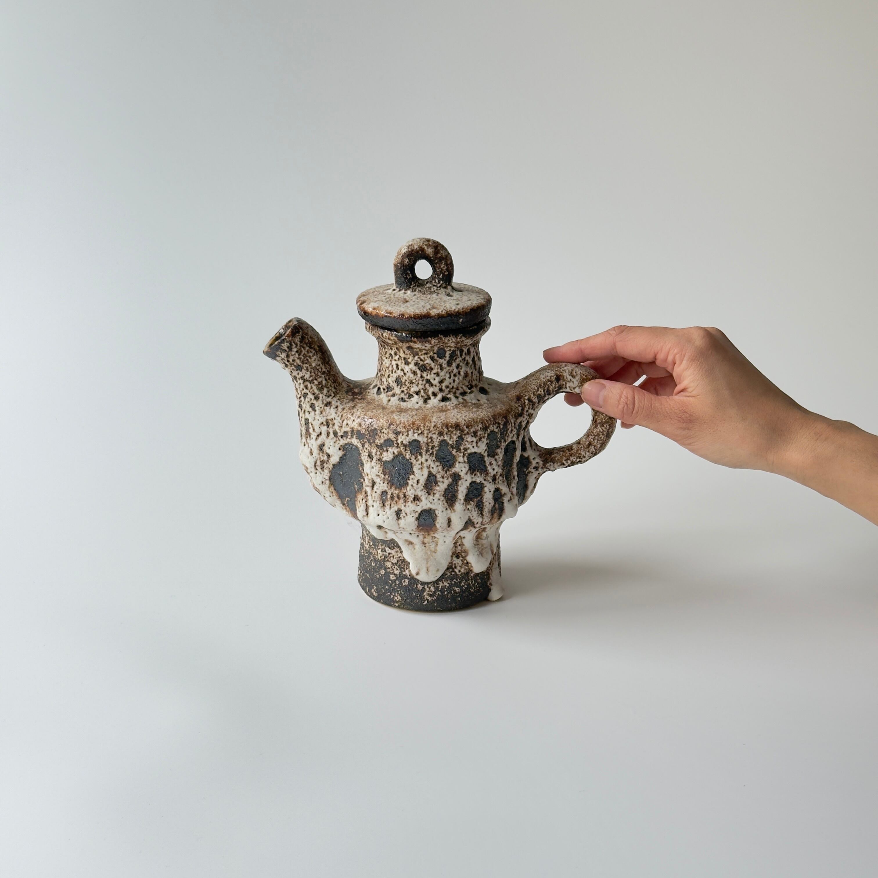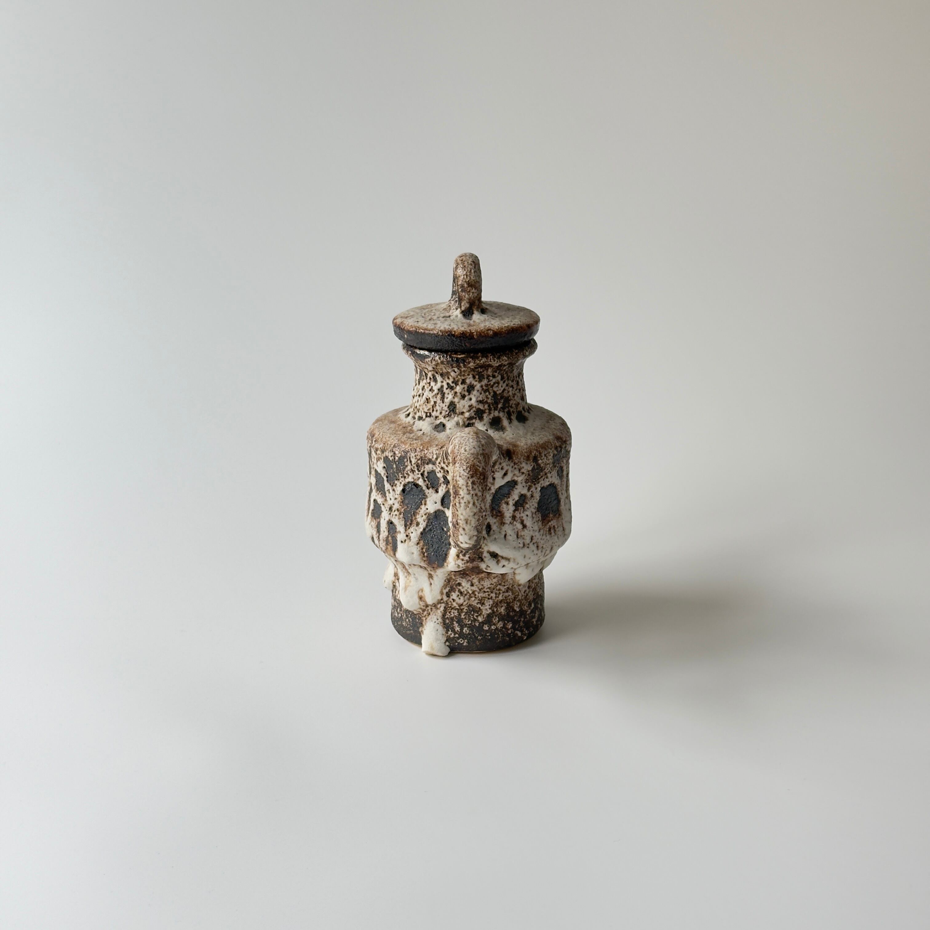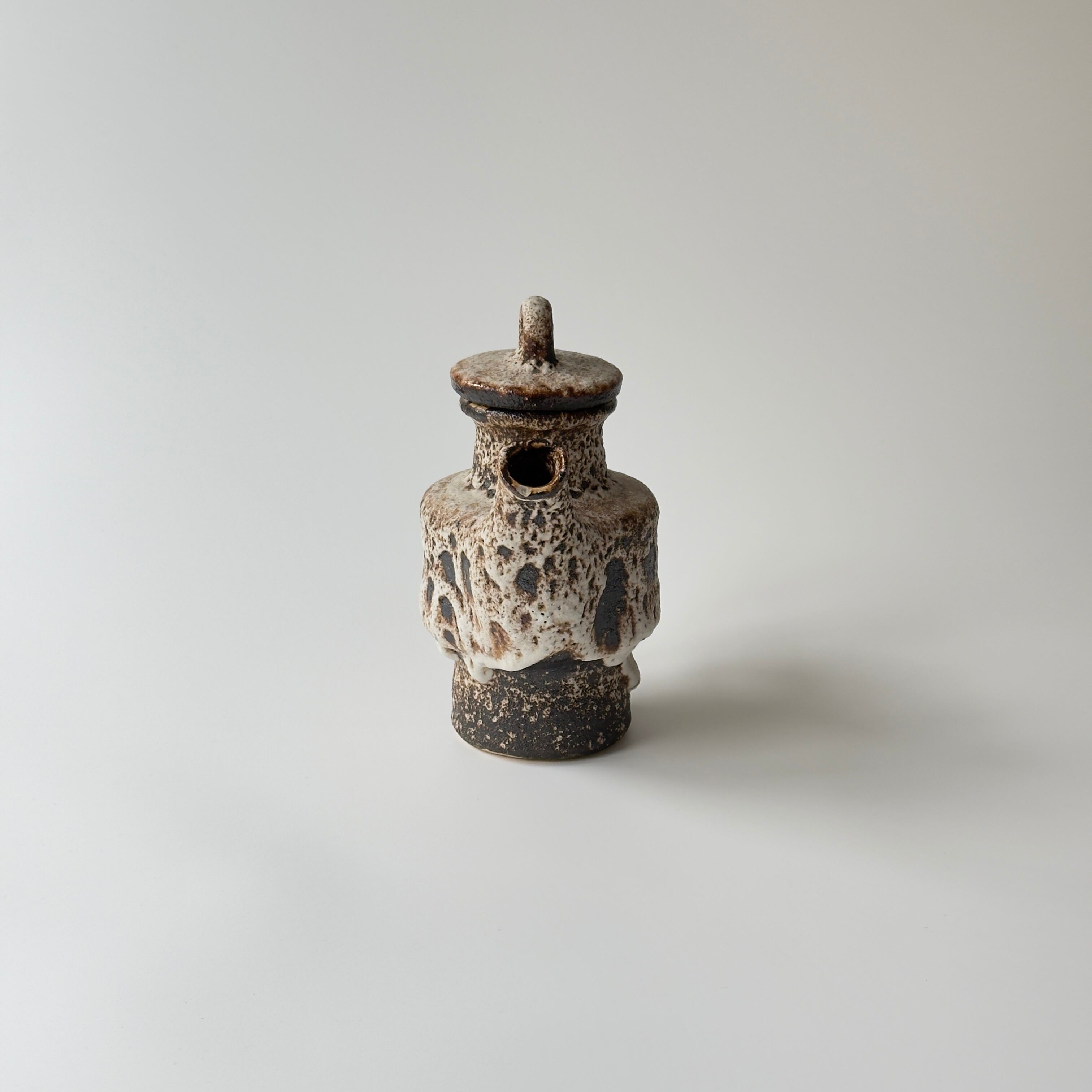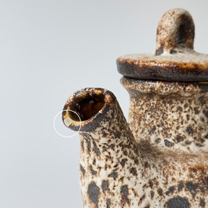 蓋付きの急須型となっています。独自の釉薬が、泡状の溶岩のようなユニークな質感を生み出しています。また形状も花瓶という域を超えたデザイン性の高さからオブジェとしても人気があります。