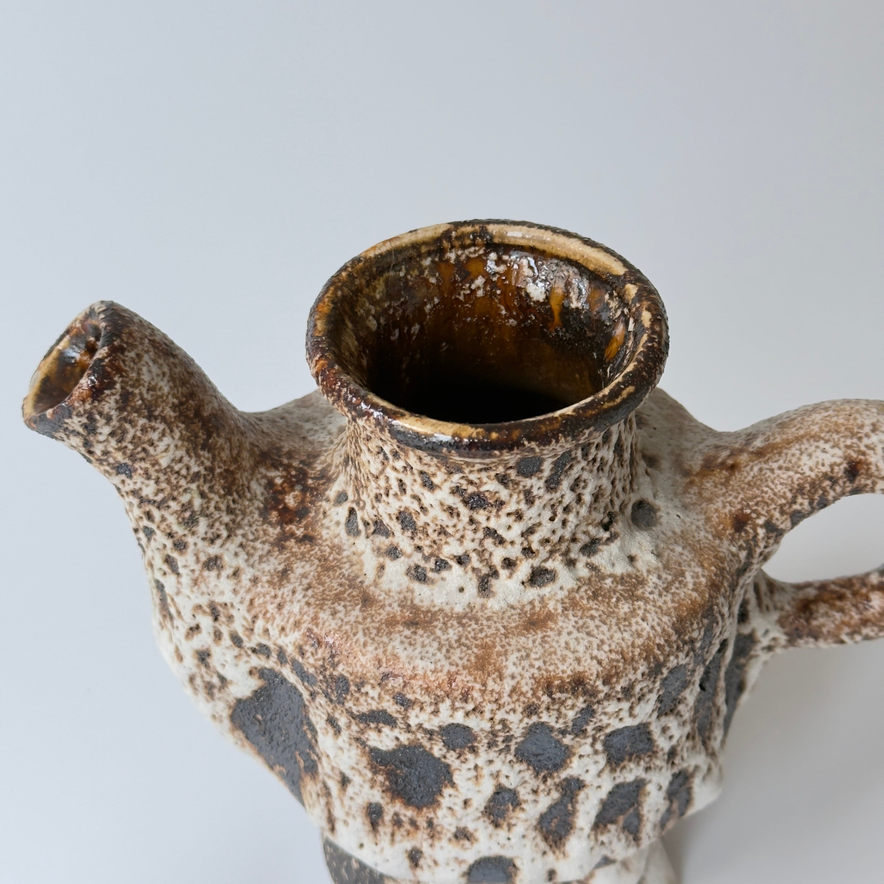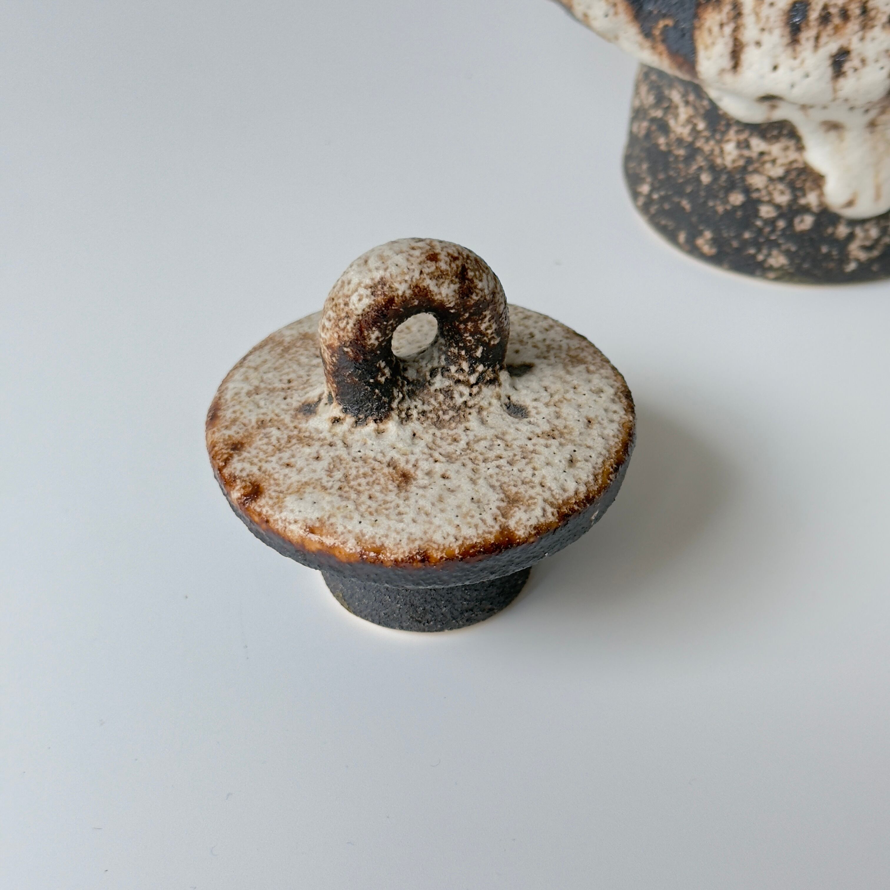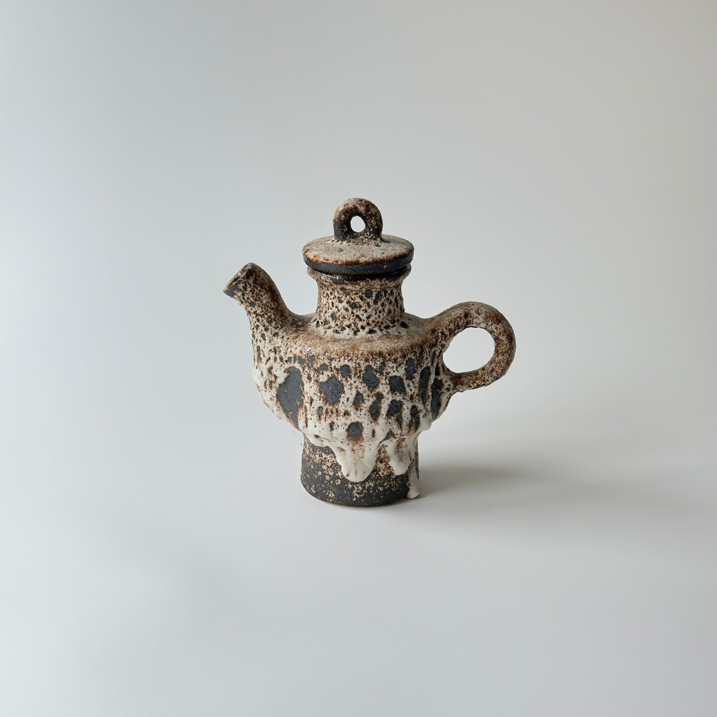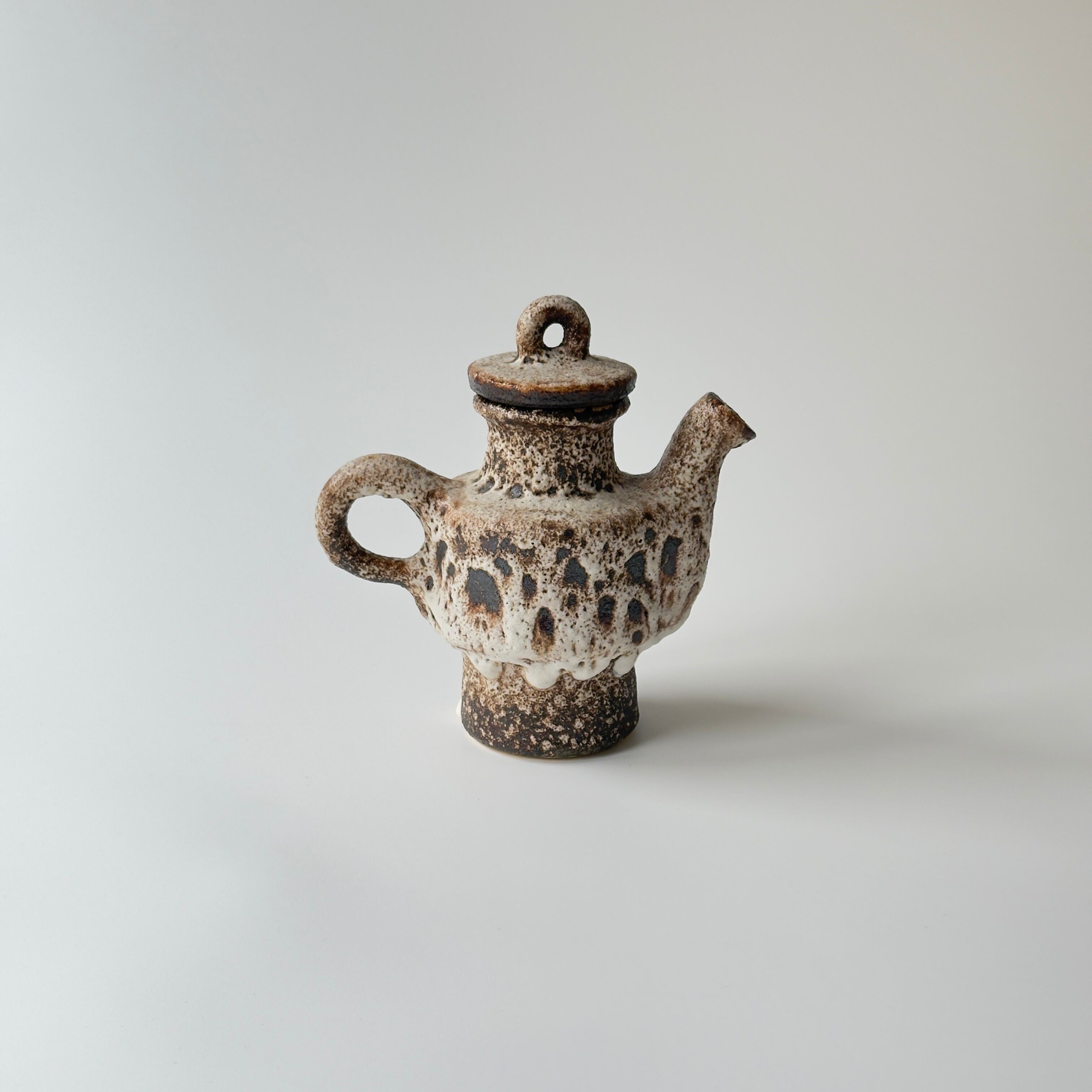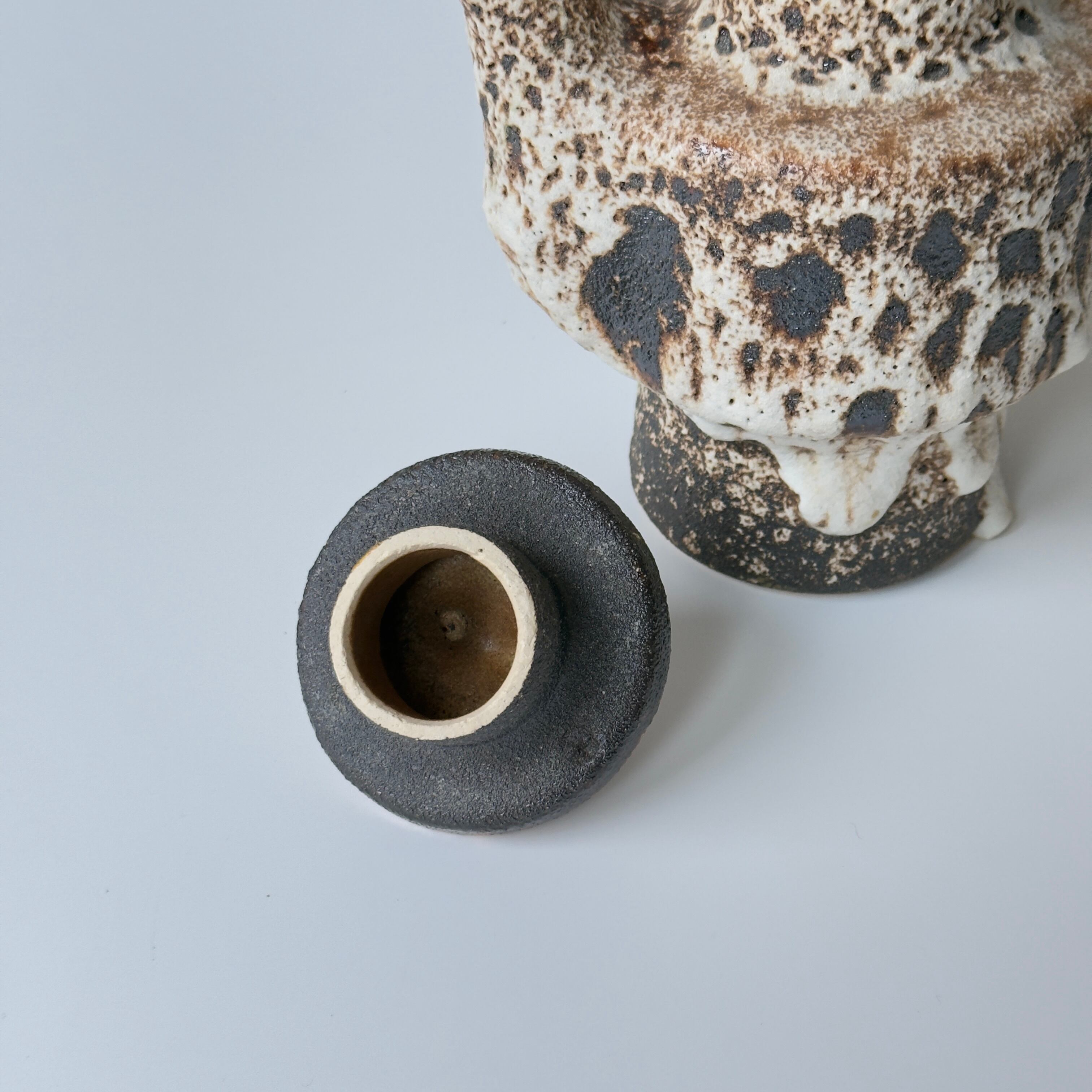 蓋付きの急須型となっています。独自の釉薬が、泡状の溶岩のようなユニークな質感を生み出しています。また形状も花瓶という域を超えたデザイン性の高さからオブジェとしても人気があります。