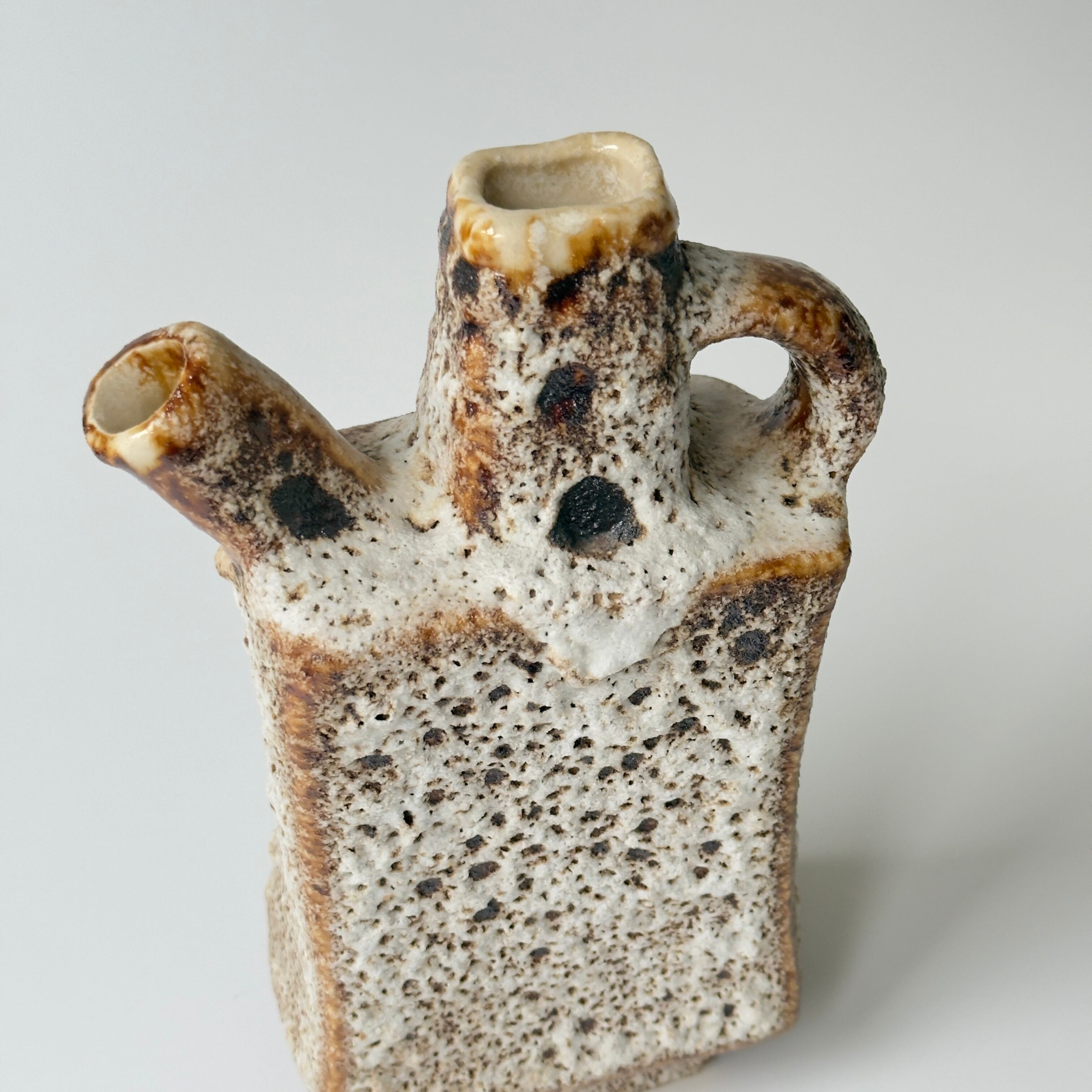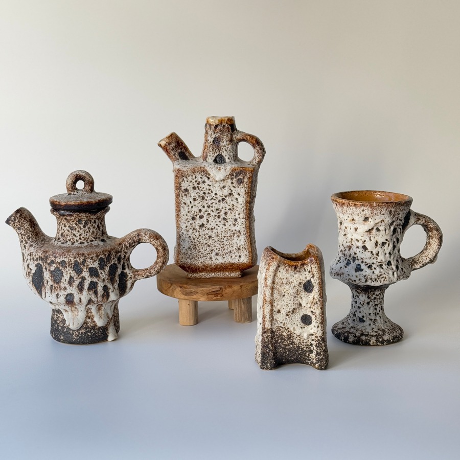 1970年代に流行していたアースカラーを起用して、釉薬でゴツゴツした独自の質感を出すために、窯の酸素濃度を低くして作られてます。溶岩状のFatLavaによく似た作品が多く、FatLavaブームの火付け役に一役買ってます。